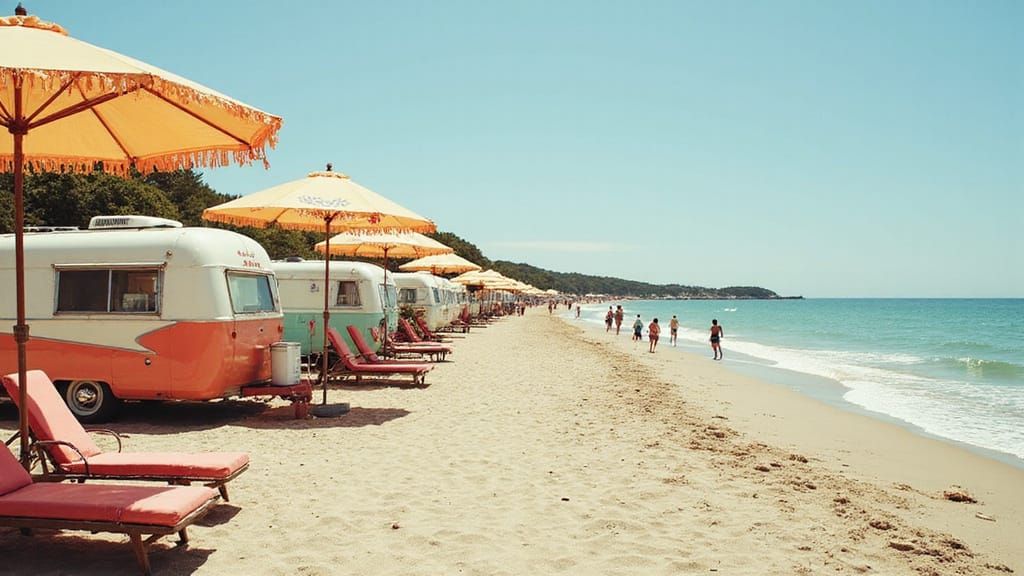 This image shows a vibrant seaside scene with vintage caravans lining a sunny promenade. The scene evokes a retro feel with colourful bunting, beach chairs, parasols, and people enjoying ice cream in 1960s swimwear. The art style is bold and saturated.
