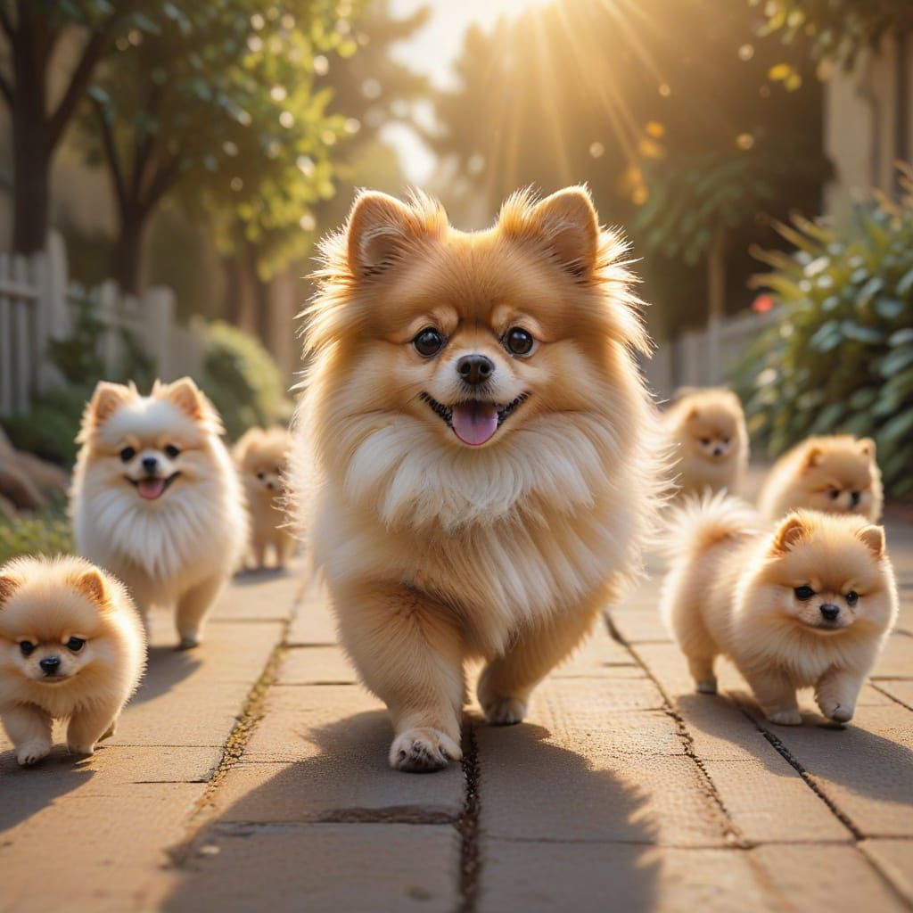 This image showcases a mother Pomeranian and her adorable puppies in a heartwarming scene, captured in a whimsical digital painting style with soft pastel colors and fluffy textures.