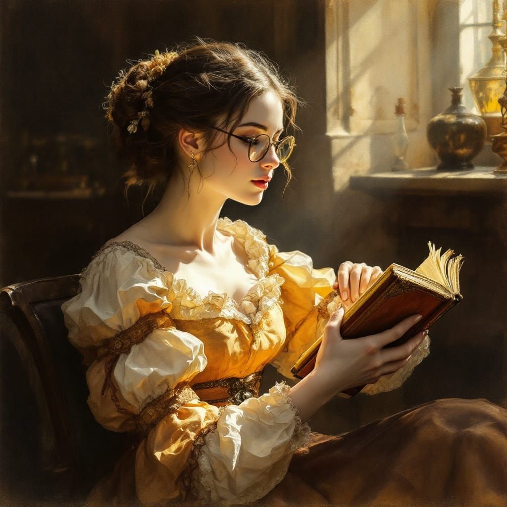 This image depicts a woman with porcelain skin in a warm amber light, engrossed in a gilded book. Her pose suggests deep thought in a 17th-century study, rendered with soft focus and watercolor fluidity.