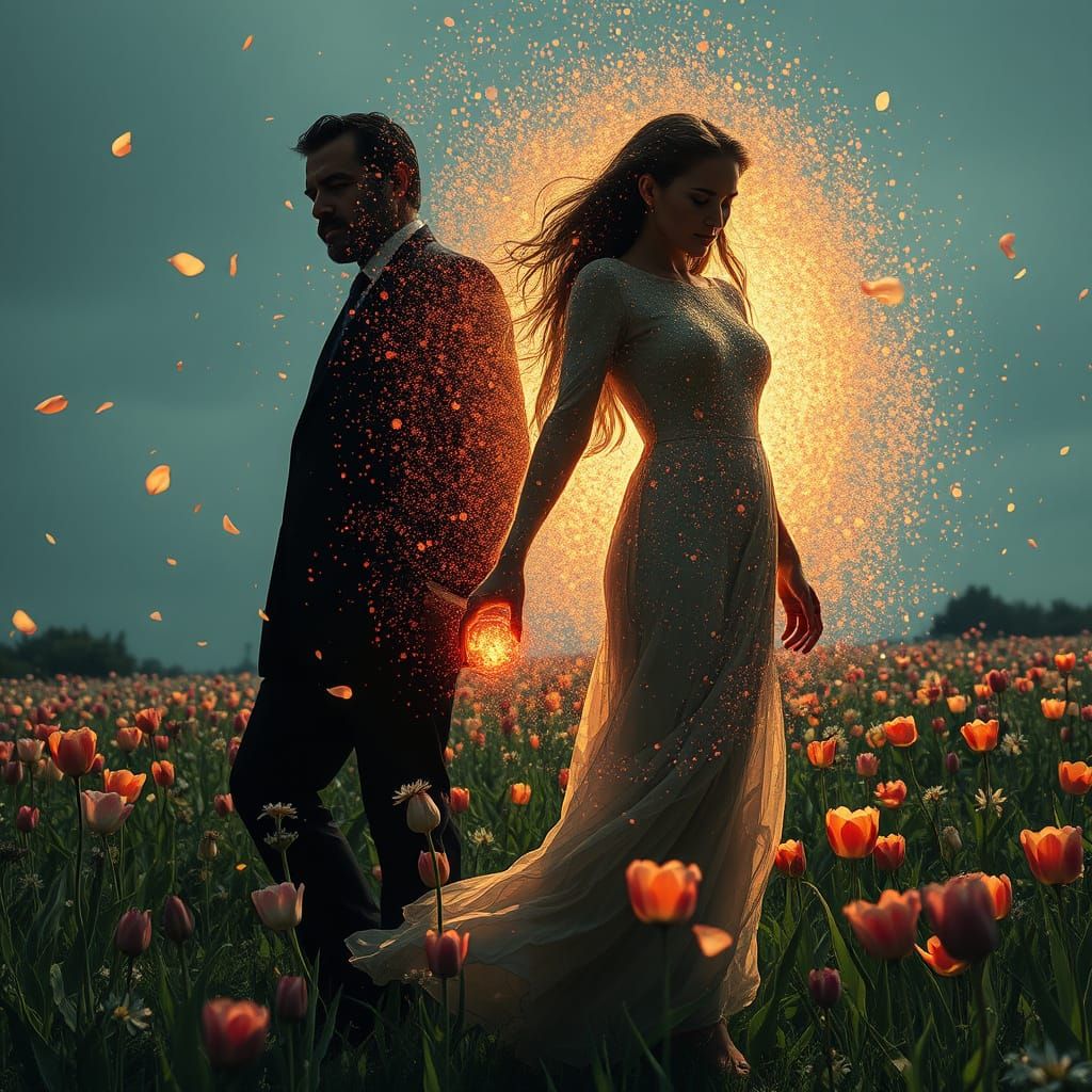 This surreal image depicts a woman standing in a lush, green environment, surrounded by flowers and a sense of hope. Her vibrant aura symbolizes inner strength and power, as she strives to save the world amidst a backdrop of decay and transformation.