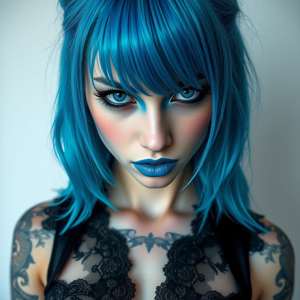 This image showcases a young woman with vibrant blue hair and porcelain skin, gazing intensely in a photorealistic portrait. Her face features bold eyeliner, electric blue lips, and a delicate nose ring, set against a high-contrast background. Intricate tattoos adorn her chest and arms, rendered in exqui...