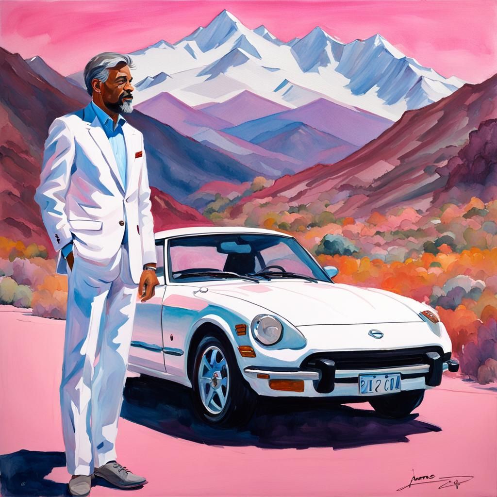 A vibrant image of a stylish man in a white suit posing next to a pink Nissan Z car with a mountain backdrop. The artwork is rendered in a maximalist, impressionist gouache style.