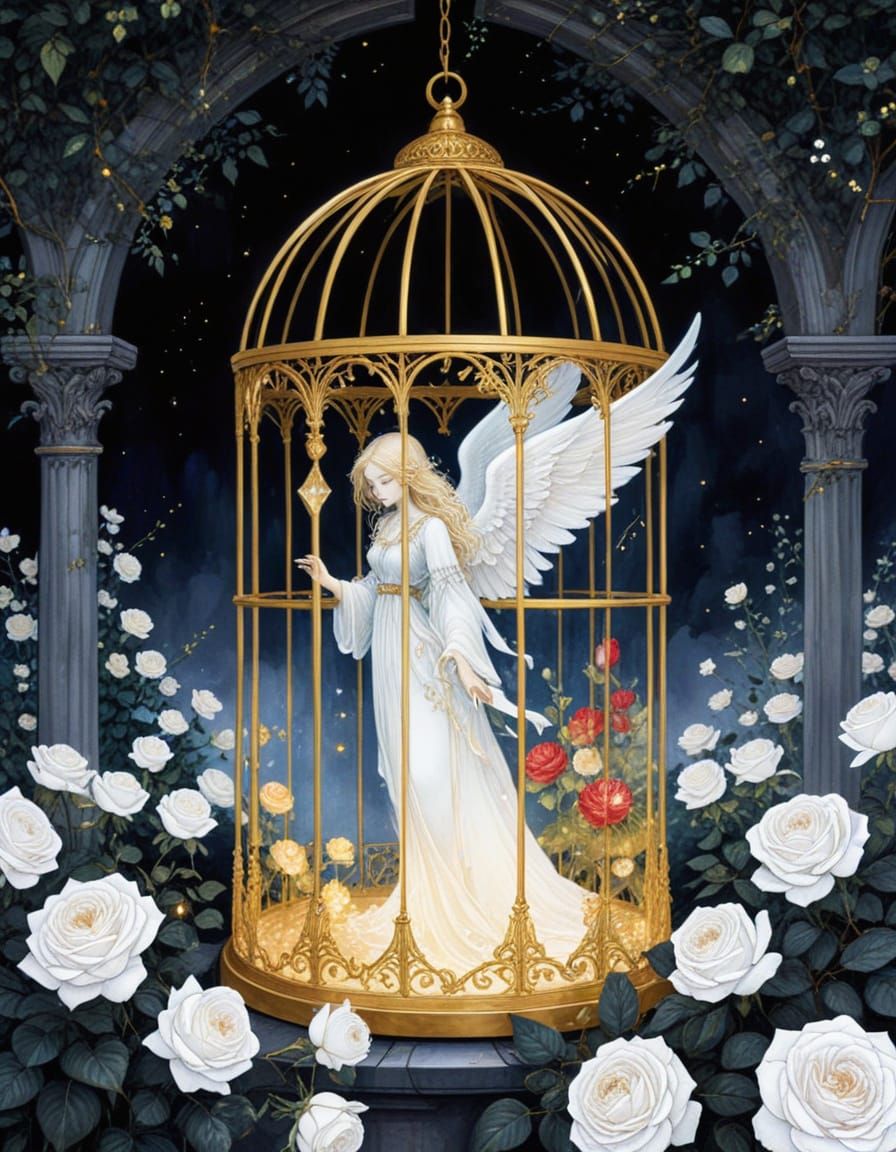 Generate your own intricate gothic angel paintings with white roses and golden cages. Free and easy AI art creation.