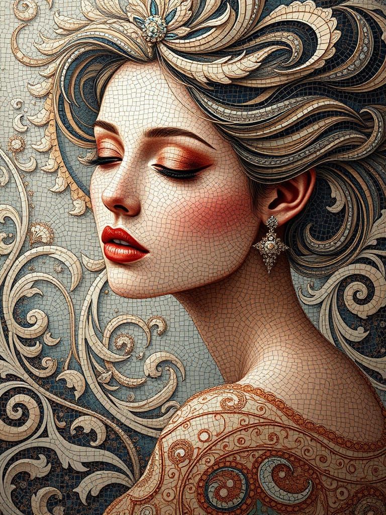 This image showcases a captivating, dreamlike mosaic portrait of a woman, radiating refined beauty and understated power through delicate patterns and swirling designs, blending Art Nouveau, Symbolism, and Pop Art elements.