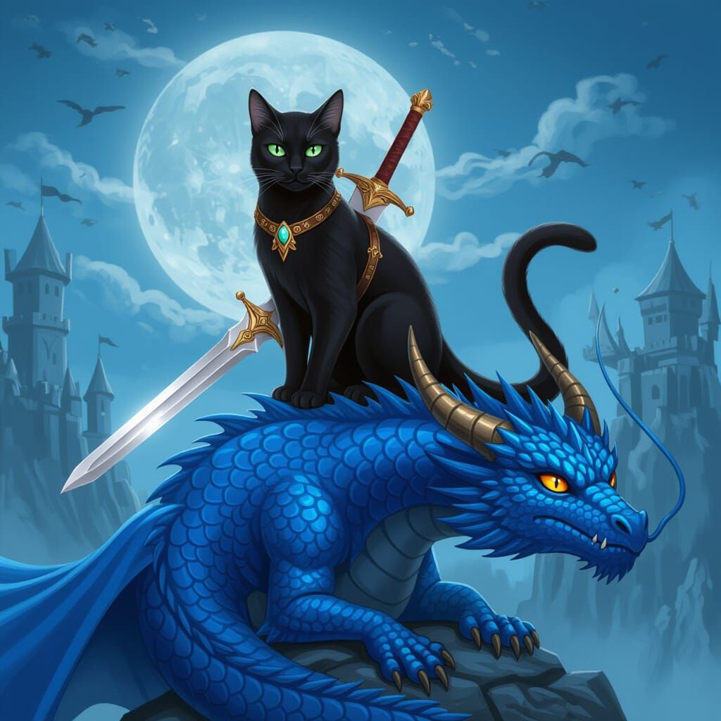 A digital illustration of a dark cat, regally dressed and wielding a sword, riding a majestic blue dragon. A fantasy concept brought to life with vibrant colors.