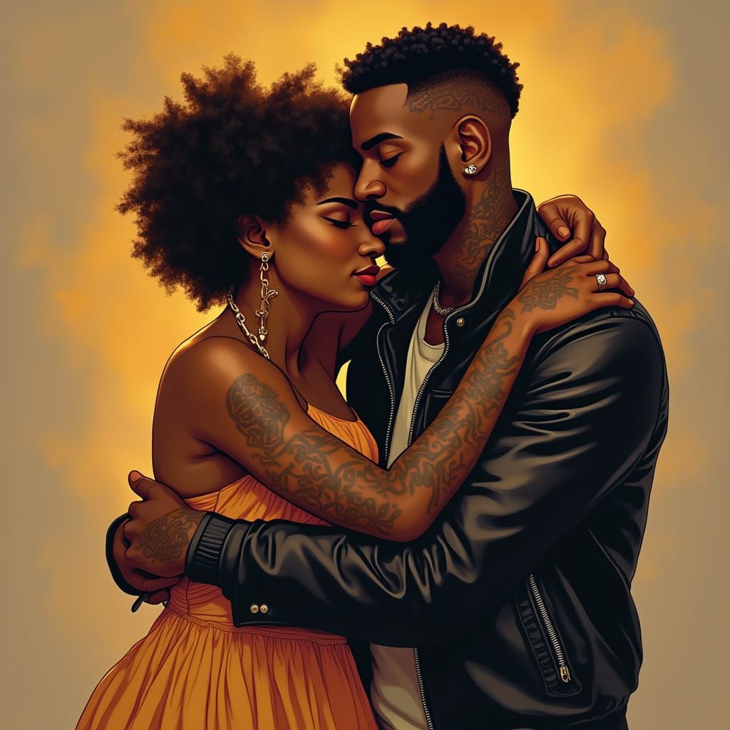 This image depicts a tender moment between a tattooed man and a woman in a flowing dress, surrounded by soft lighting, reflecting the vibrant styles of contemporary artists.