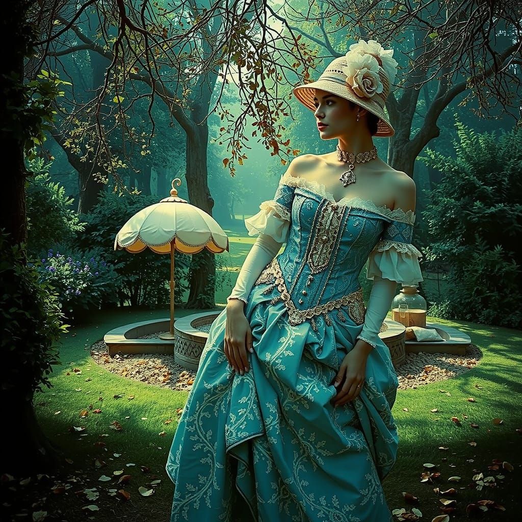 A photorealistic image of an elegantly dressed figure in vintage clothing in a French countryside. The soft, golden light and idyllic setting create a romantic scene reminiscent of classical art.