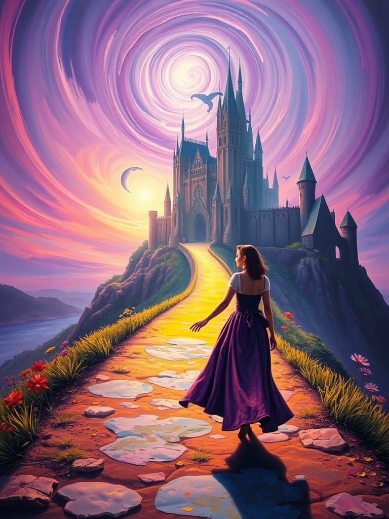 This image depicts a woman artist crafting a vibrant dreamscape, with a couple ascending a luminous pathway to a gothic castle, set against a swirling, violet-tinged sky with an ethereal glow, showcasing intricate, surreal details and symbolism.