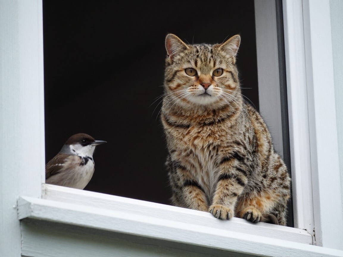 This image captures a cat intensely watching a bird from its window perch, embodying a hunter's eternal, yet perhaps unfulfilled, watch.