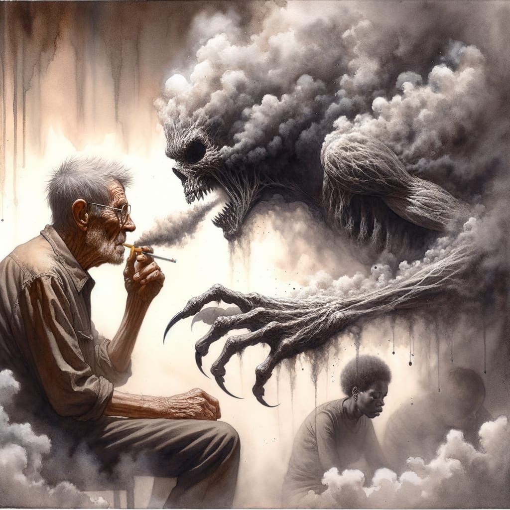 This image shows an elderly man exhaling cigarette smoke that forms into a terrifying demon. A nearby woman appears to be losing her life force to the entity, rendered in a watercolor aesthetic.