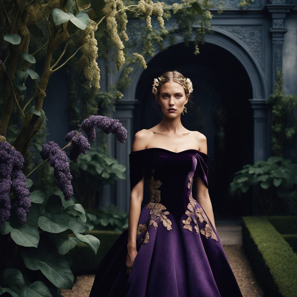 In an ancient garden, a regal model stands in the midst of deadly nightshade vines, wearing a velvet purple gown that cascades to the ground in elegant folds, mimicking the bell-shaped blooms of the plant. The sophisticated, form-fitting bodice accentuates her slender waist, while the long flowing skirt mimics the organic shapes of the plant. Her long ..."