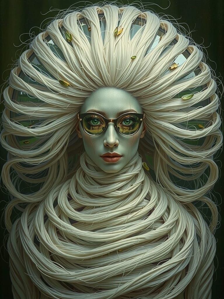 she's hollow mirrors on nature mock her embodied ivory-white hair like scaffolding holds a series of recursive wild mirrors climbing up and around her bunched hair-strands in layered hollowness reflecting the futility of right now pull back into a wide angle wild angle full-length long shot mirroring ...