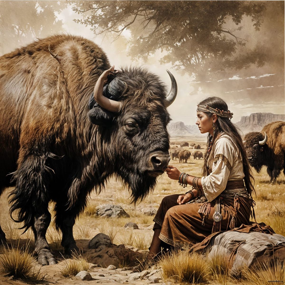 This image shows a Sioux girl gently interacting with a bison, rendered in deep, vibrant sepia tones with an artistic flair.