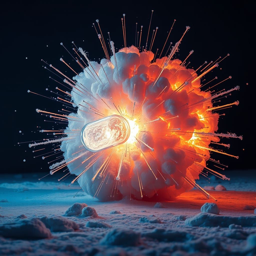 A post-apocalyptic scene depicting a nuclear explosion, where a fission bomb fails to ignite a frozen hydrogen capsule, amidst a desolate and ruined environment, with a dark and ominous tone.
