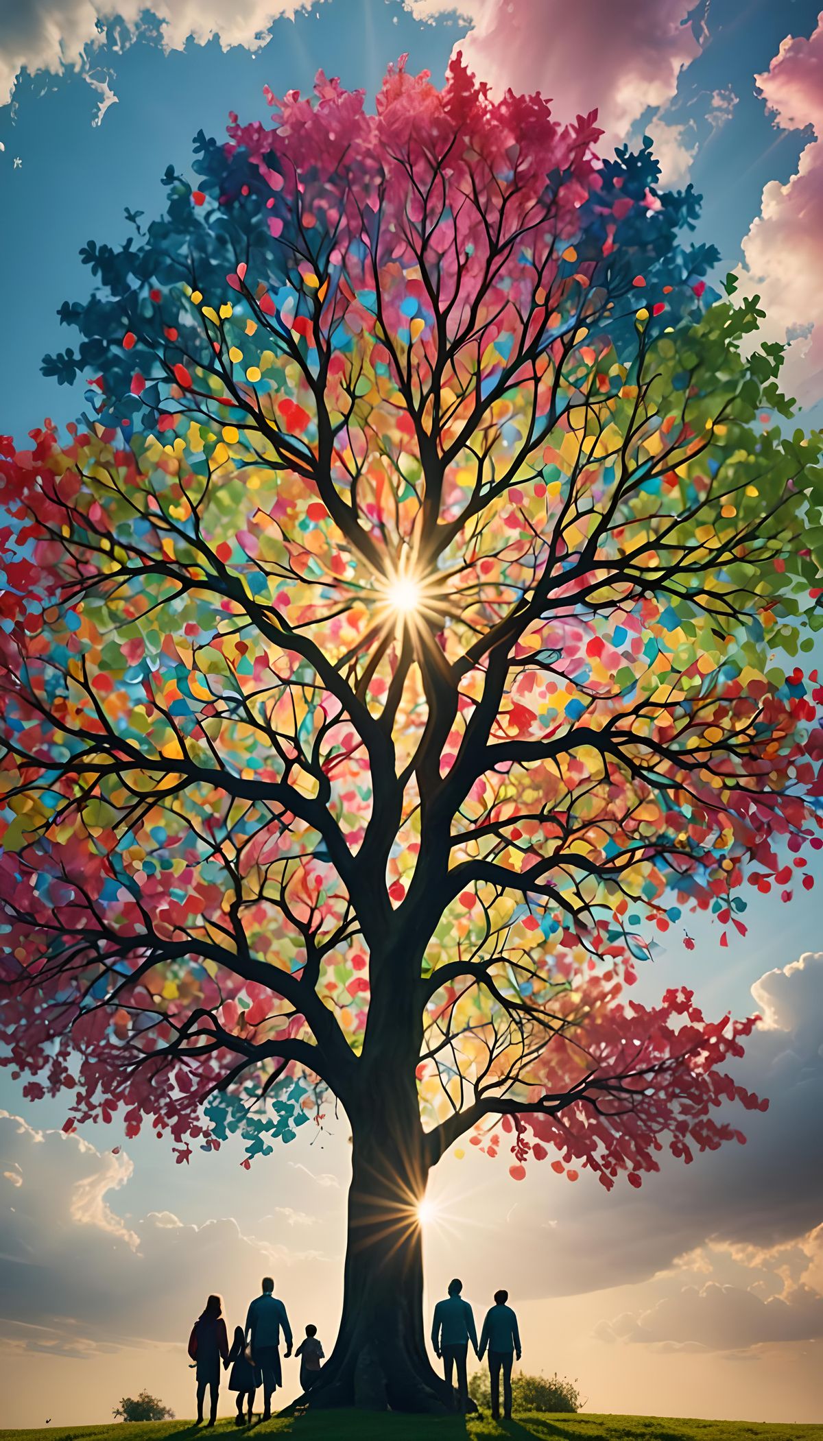 This image shows humans in the shape of a tree, rendered with red, blue, yellow, green and pink colours. Divine sunshine beams through soft clouds in this spiritual image.