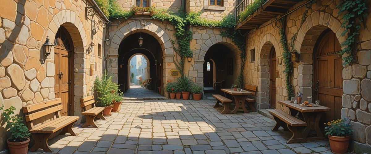 A whimsical folk art illustration of a mysterious passageway featuring benches and tables. The scene is bathed in bright sunlight, emphasizing the delicate stone walls and arches in pastel colors.