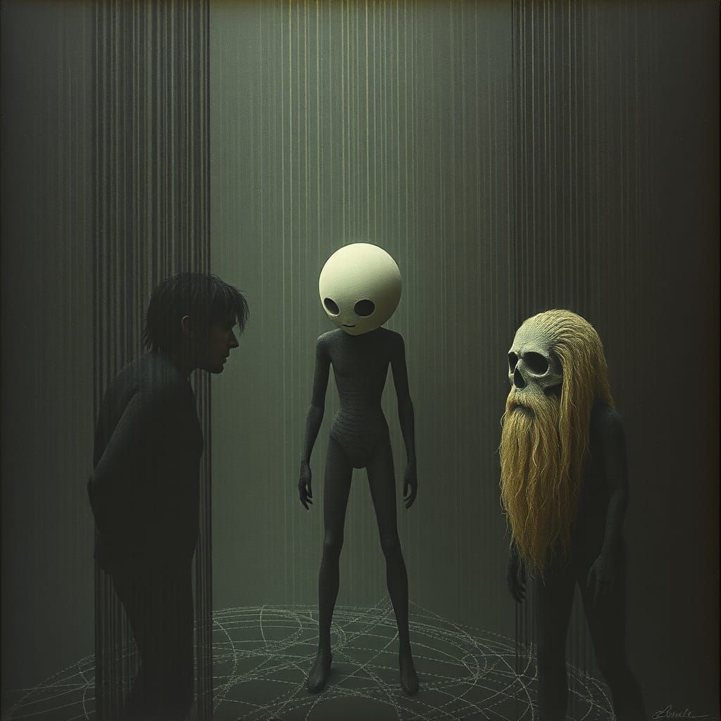 This image combines dark fantasy elements with a pointillist technique, reminiscent of Georges Seurat's style, and features a mysterious subject with a hint of industrial design