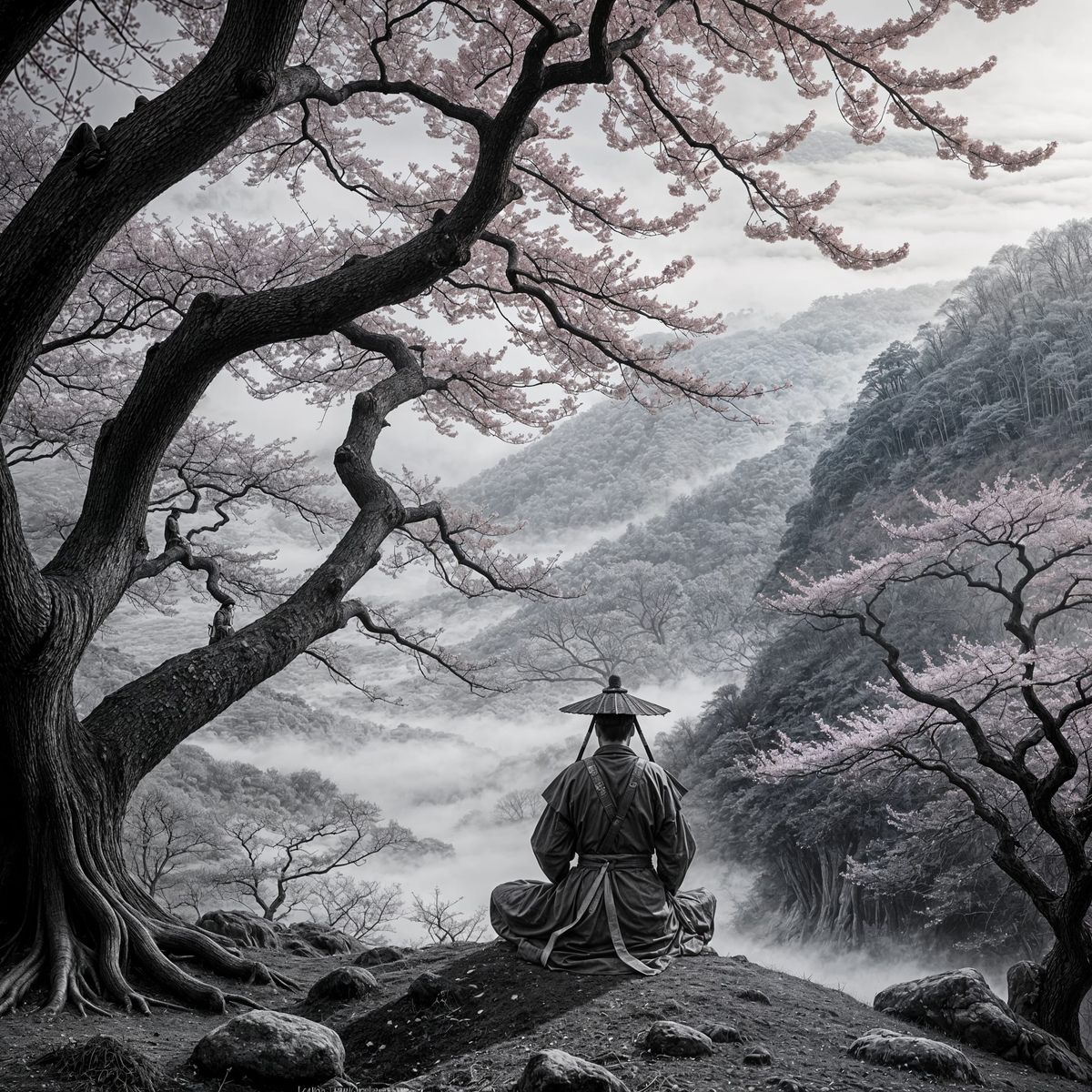 This image shows a lone samurai meditating beneath a large cherry blossom tree in a misty mountain scene. Evocative black and white photography with dramatic shadows.