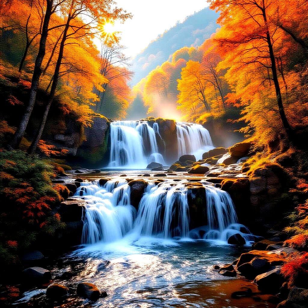 Generate your own beautiful autumn mountain waterfall photos with our easy-to-use AI tool. Free to try!