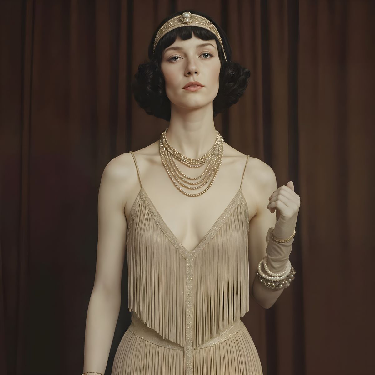 This image shows a glamorous portrait of a woman in 1920s flapper attire. The portrait features art deco jewelry, a champagne fringed dress, and dramatic lighting in a fashion photography style.