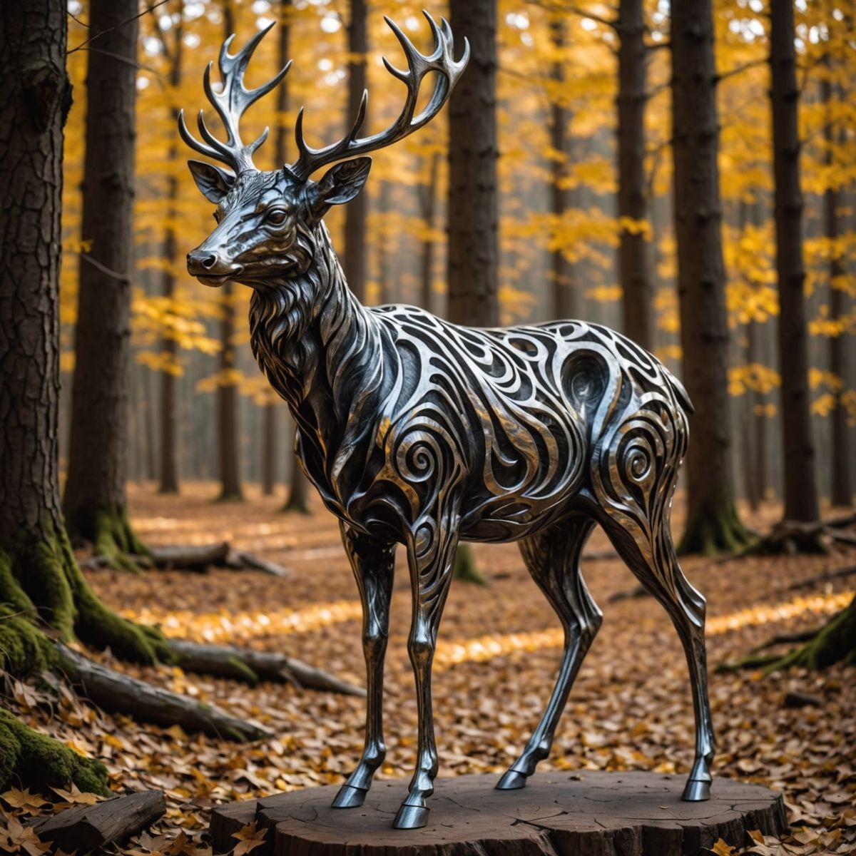 Beautiful deer made of polished damascus steel, swirls and waves in the steel create mesmerizing patterns and designs throughout the deer’s sleek body. It stands elegantly in the woods with sunlight reflecting off its metallic body. Perfectly crafted damascus steel sculpture, perfect composition, sharp ...