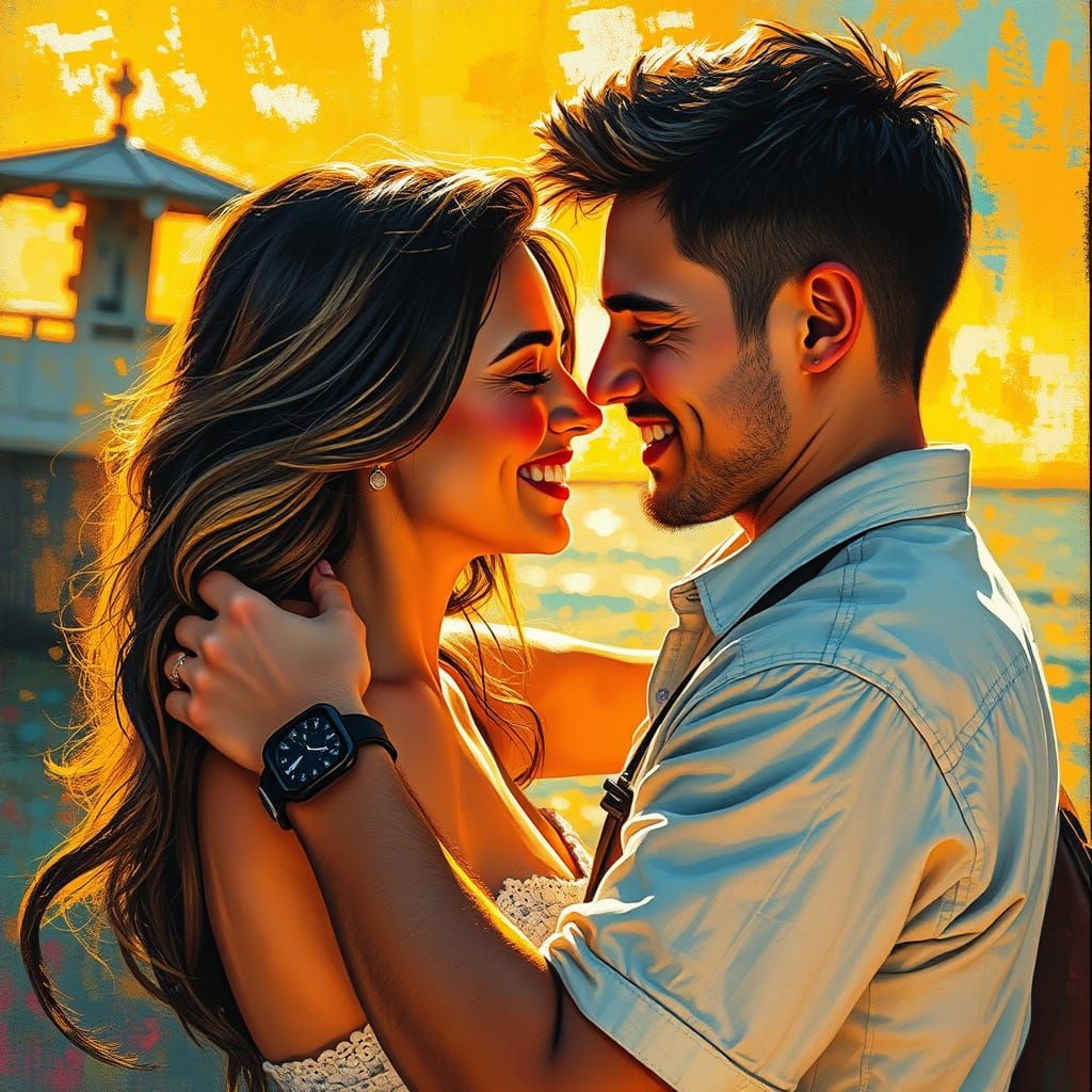 This dynamic, museum-quality artwork captures a young couple's intimate moment in warm, golden light. Thick brushstrokes and textured gouache evoke energy and spontaneity, blending traditional media with hyperrealistic detail.