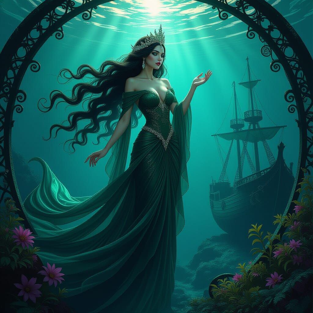 A beautiful siren queen rises from the ocean depths, her gown flowing, hair like seaweed, adorned with glowing pearls. The image features iridescent scales, bioluminescent flora, and dramatic lighting, rendered with intricate Art Nouveau details.