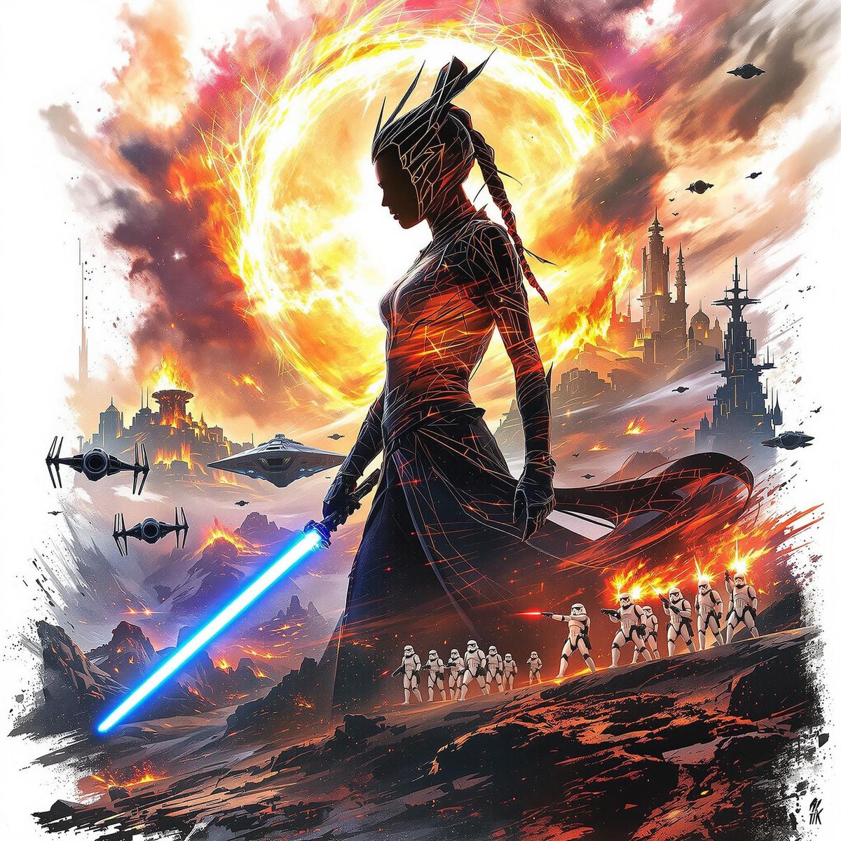 This image shows a striking double-exposure illustration of Ashoka Tano, set against a stark white backdrop, amidst a chaotic, dystopian landscape with blazing fire castles, erupting volcanoes, and Imperial Star destroyers. Rendered in a biomechanical style with intricate textures and subtle shading.