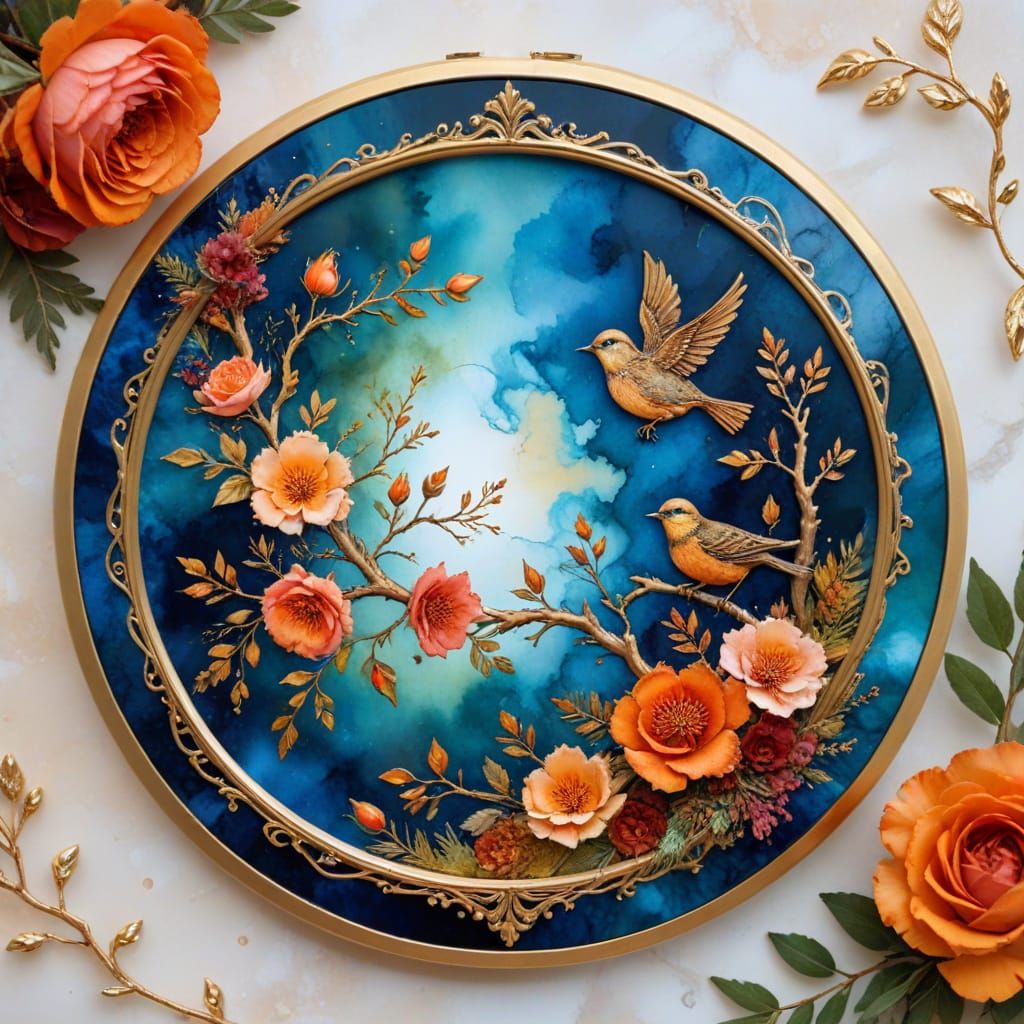 This image showcases alcohol ink art with a circular design. It features clouds, orange moss rose flowers, and a bird on a twisted branch, all within a gold frame. Deep rich tones and bokeh effect add to the dreamlike quality.