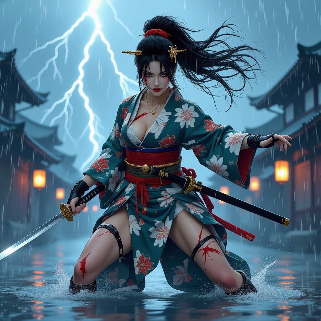 A hyper-realistic depiction of a battle-worn geisha warrior in a storm. Torn clothing, flowing hair, and dramatic lighting capture intense Ukiyo-e inspired action.