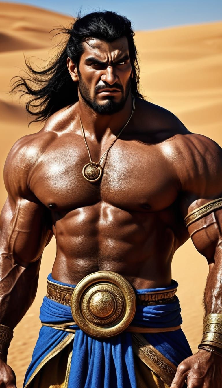 A photorealistic image of a muscular, shirtless Persian djinn with a desert backdrop. This picture captures a powerful, angry genie with striking features, including gold claws and pointed ears.
