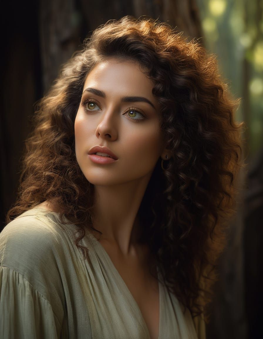 This image shows a photorealistic oil painting of a beautiful young woman gazing into the distance. The artwork features soft brushstrokes, a warm color palette, and gentle textures, creating a dreamy atmosphere.