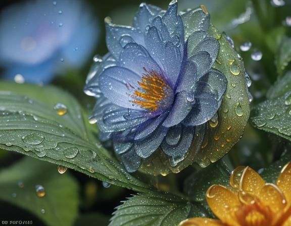 (Dew Drops:1.5) Flora, scattered fabulous autumn colorful leaves, blue dew on the leaves, water drops, evening sky with stars, orange autumn flowers in a small bouquet, fantasy, night background.