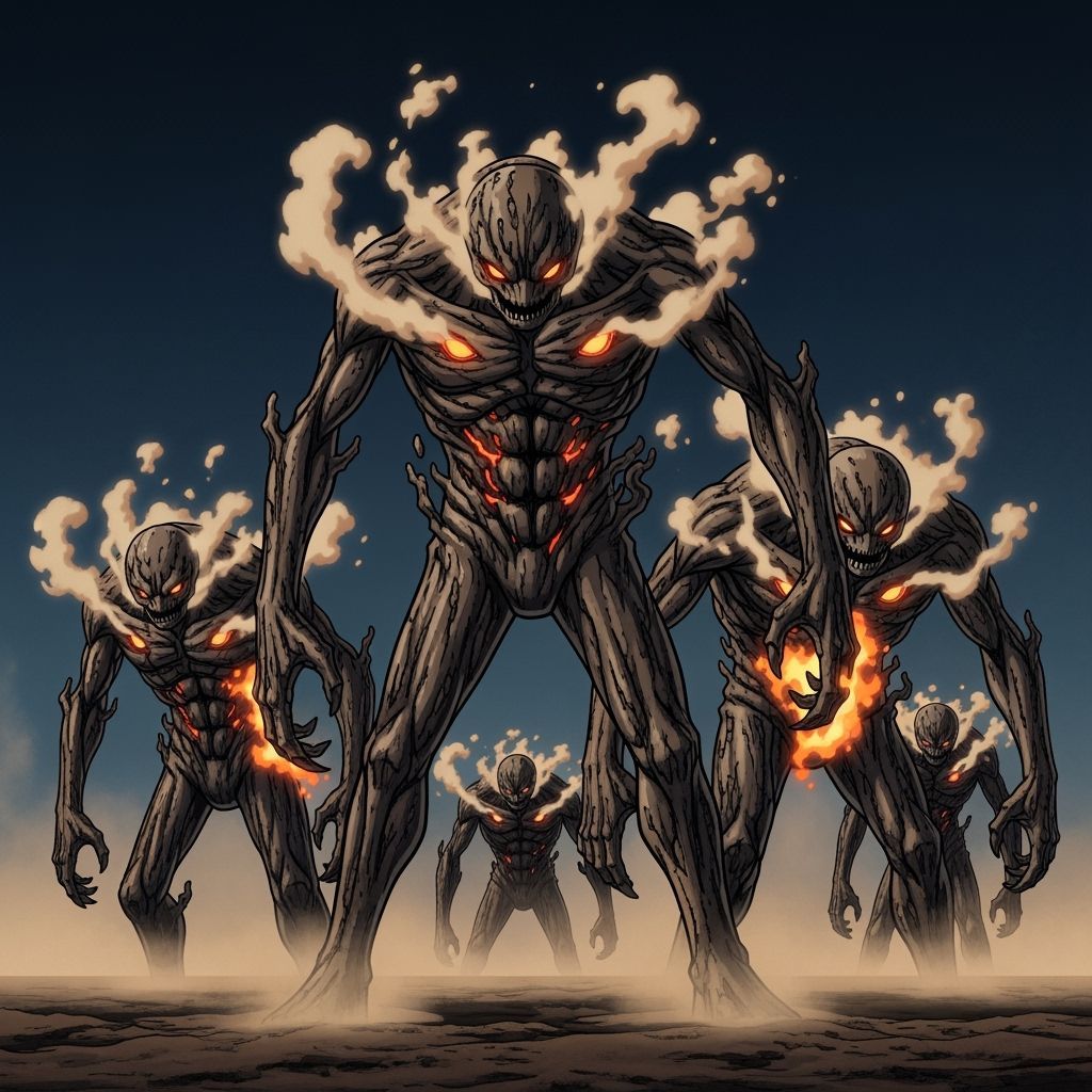 This image depicts Venmuks, fascinating beings composed of natural elements and pollutant energies, rendered in a vibrant Manga Scan style with dynamic cinematic lighting and deep colors.