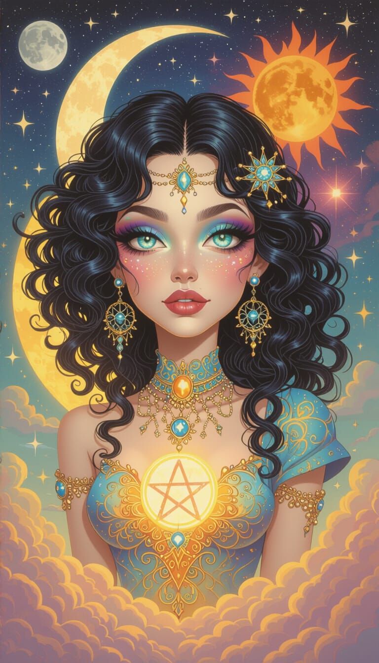 A vibrant 3D chalk-style image of a beautiful enchantress with turquoise eyes, jet-black curly hair, and dramatic makeup. She wears a glowing blue gown with celestial adornments under a starry night sky in a spacepunk aesthetic.
