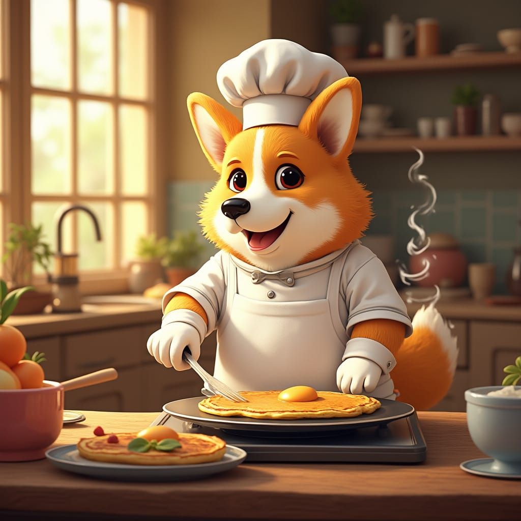 This image features a charming corgi chef in a sunlit kitchen, flipping pancakes with flair, amidst rustic cabinetry and warm golden tones, in a vibrant Art Nouveau aesthetic with soft brushstrokes and dynamic lighting.