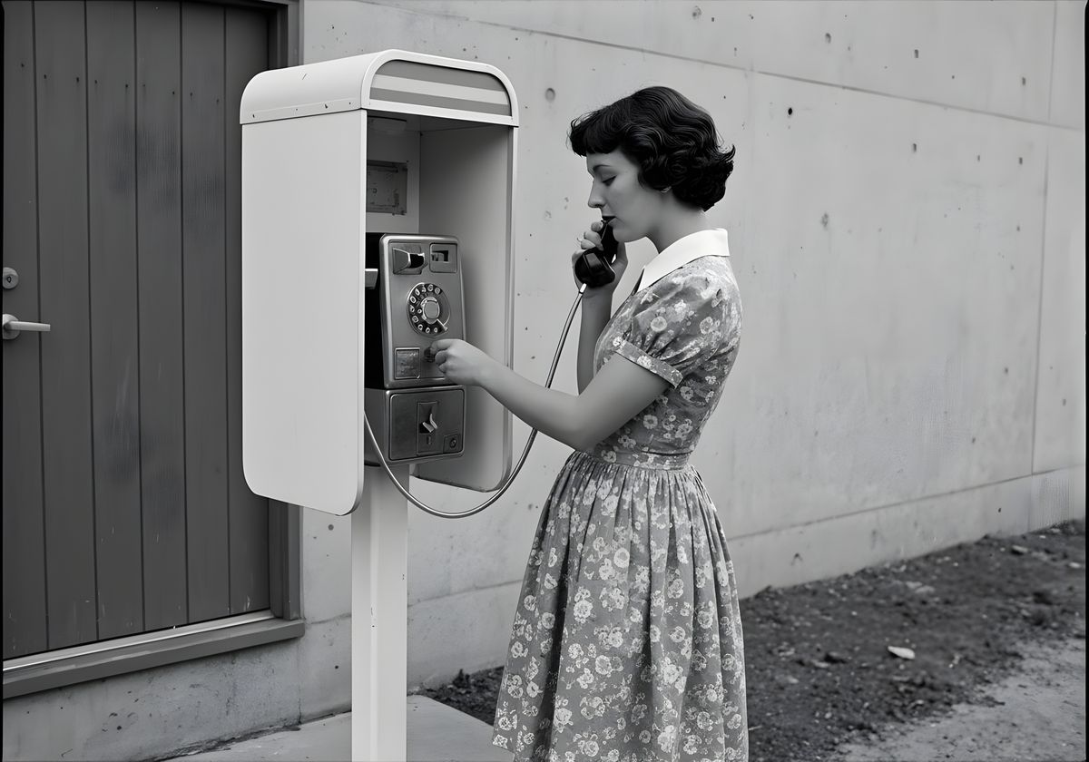 This image shows a woman in a floral dress using a vintage payphone. The black and white photograph has a retro, moody atmosphere enhanced by a film grain effect.