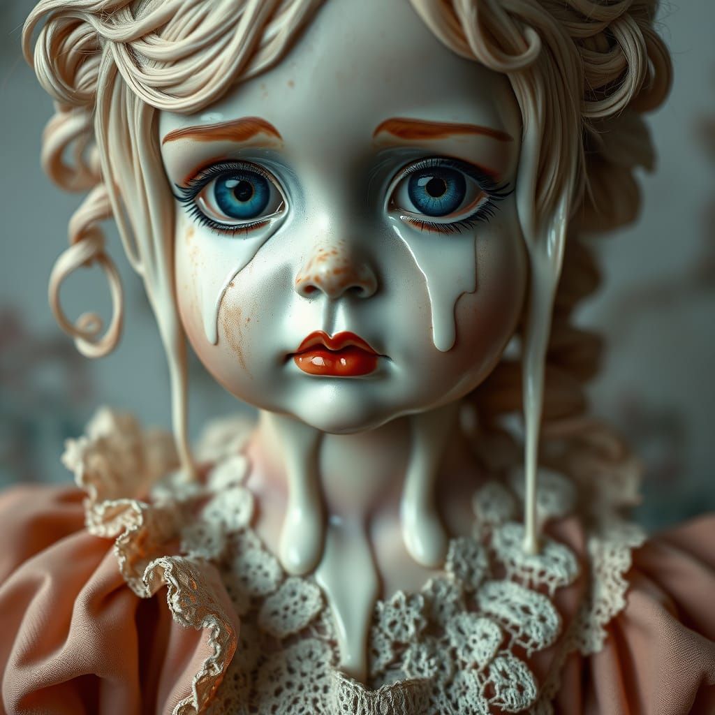 This haunting portrait of a porcelain doll captures a surreal, dreamlike quality as her delicate face melts into a swirling vortex of pastel-colored wax, evoking the eerie, abstract beauty of Dalí-esque landscapes.