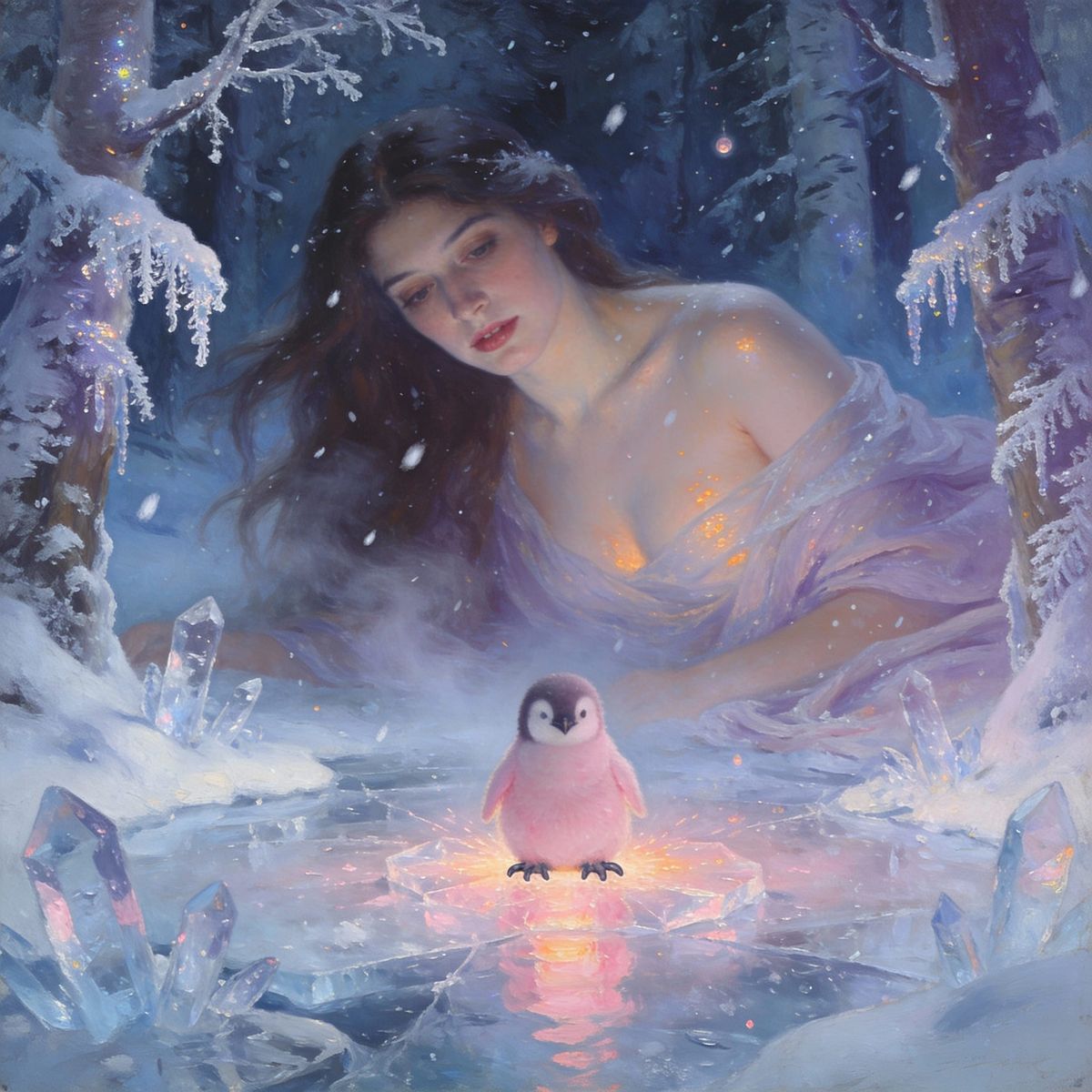 This image shows a beautiful woman in a frozen enchanted forest, illuminated by a glowing pink penguin. Rendered as an oil painting with luminous skin tones and fantasy illustration elements.