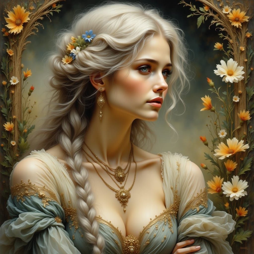 A beautiful Art Nouveau portrait of an elderly woman on her 70th birthday, with silvery hair and delicate wrinkles, wearing gold jewelry. The background features organic curves and stylized natural elements in a soft, harmonious color palette.