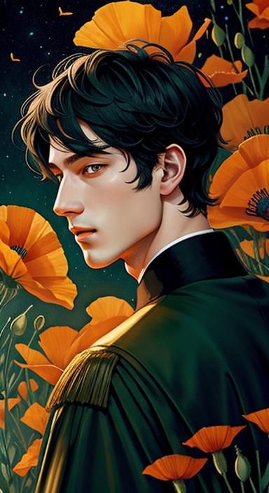 A digital portrait of a pale prince with dark hair and green eyes, illuminated by fireflies and poppies. The image showcases dynamic lighting and a minimalist inkpunk aesthetic.