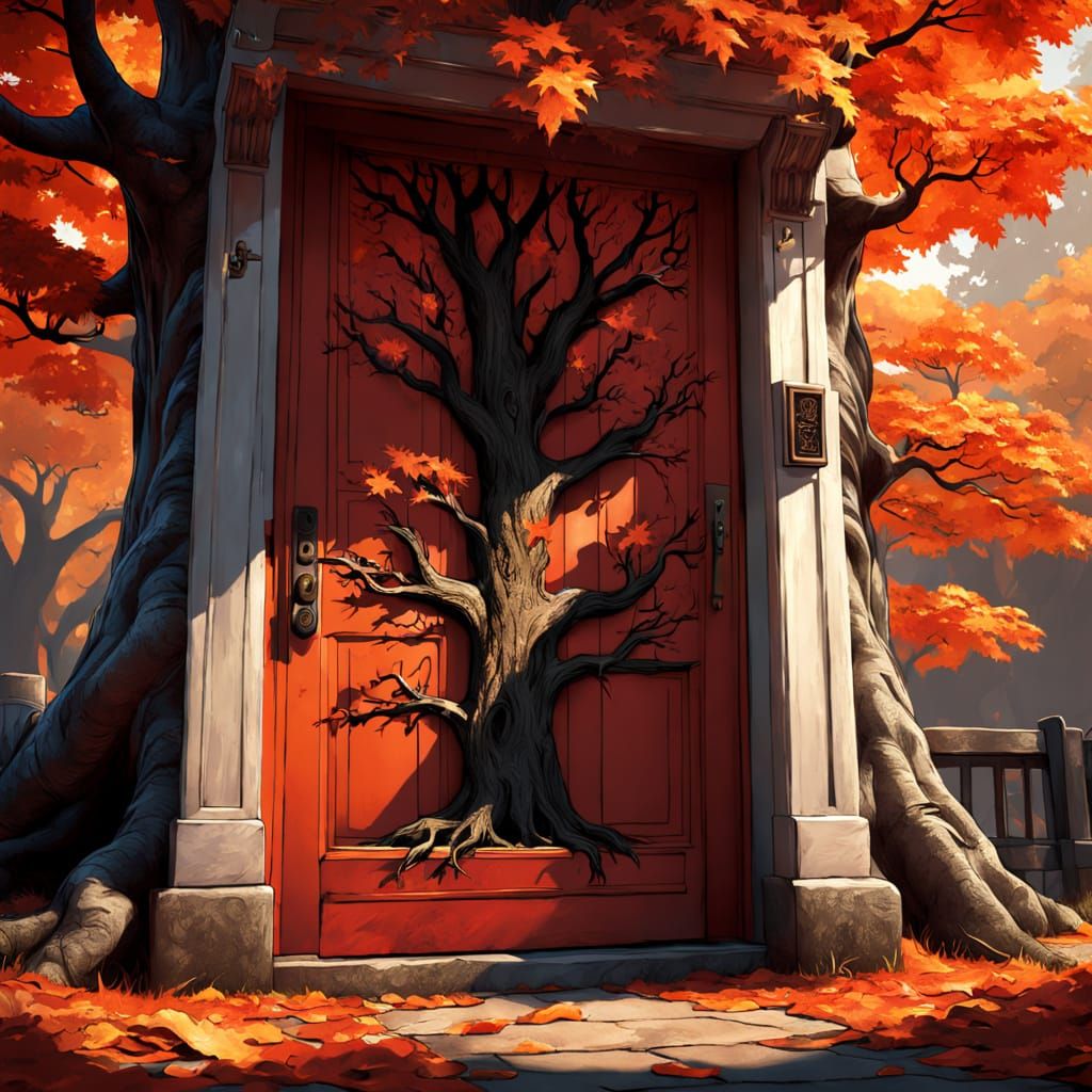 A striking picture of a vibrant red maple tree featuring a mysterious door. The artwork showcases comic book art elements, twisted roots, and warm lighting with cinematic depth.
