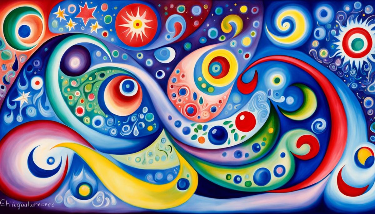 A stunning star joins the sky in a swirl of silk and jelly stars with curved lines, Maelstrom 3D (Kandisky, Miro, Chagall style:2.0), Aboriginal Art Une confluence envoûtante et onirique de formes irisées, courbes et torsadées en tire-bouchon, rappelant des créatures marines bioluminescentes, ondulant ...