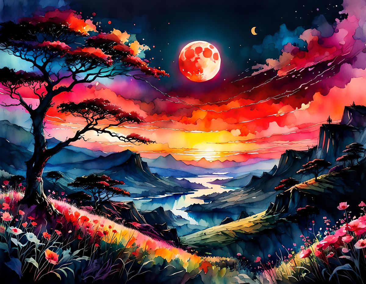 Insanely detailed bloodmoon Digital (watercolor:1.8) Illustration of a summerscape sunset, by JB, Waterhouse, Carne Griffiths, Minjae Lee, Ana Paula Hoppe, Stylized watercolor art, Intricate, Complex contrast, HDR, Sharp, soft Cinematic Volumetric lighting, flowery pastel colours, wide long shot, 16k ...