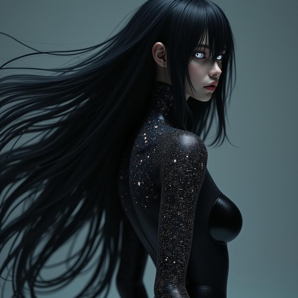 A striking picture of a woman with long, flowing black hair and piercing white eyes. Her skin features intricate circuitry patterns, and she's wearing a sleek black jumpsuit in a 3D anime art style.