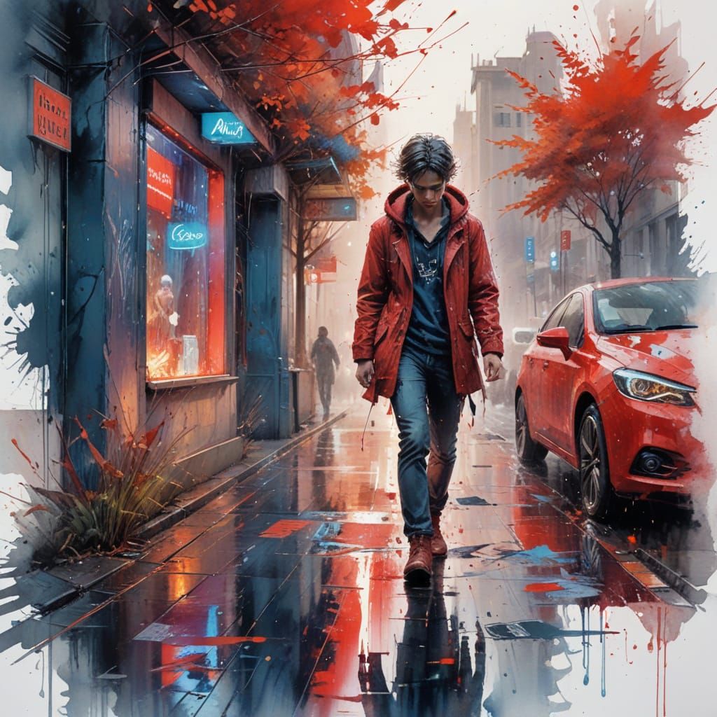 A vibrant image capturing a solitary figure walking on rain-slicked city streets illuminated by neon lights. This artwork evokes the artistic style of stylized watercolor with expressive techniques and cinematic stylization, creating a fusion of chaos and beauty.