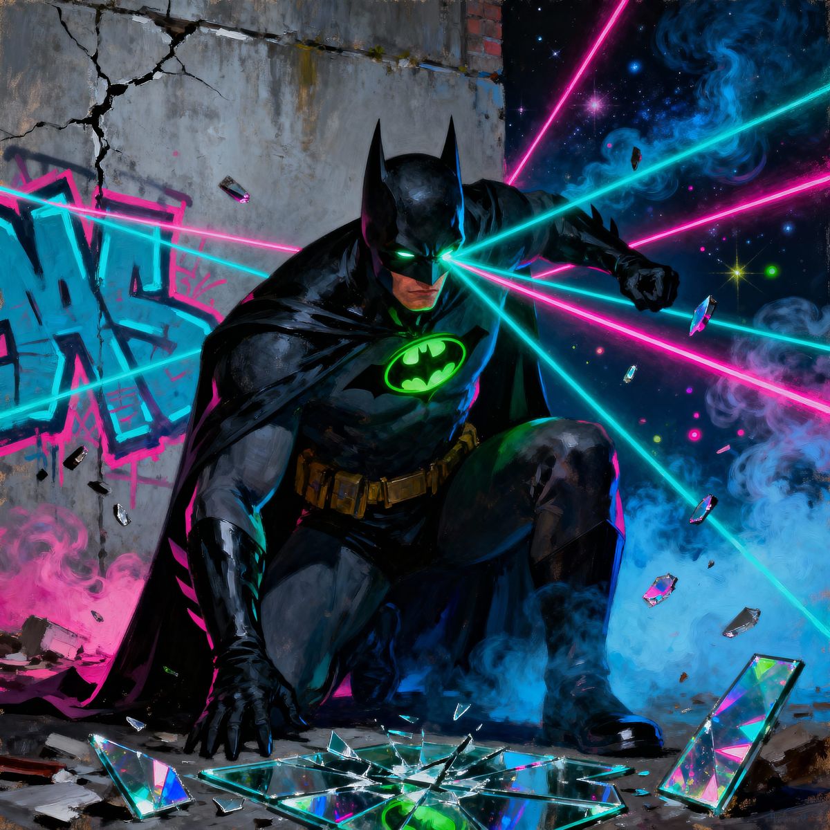 This image shows a blacklight-themed Batman with glowing laser eyes, rendered in an epic oil painting style with special effects.