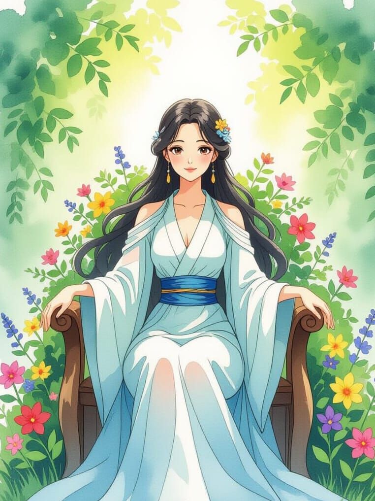 This image shows an anime-style tarot card depicting The Empress. The artwork features a watercolor aesthetic, giving it a soft and ethereal feel.