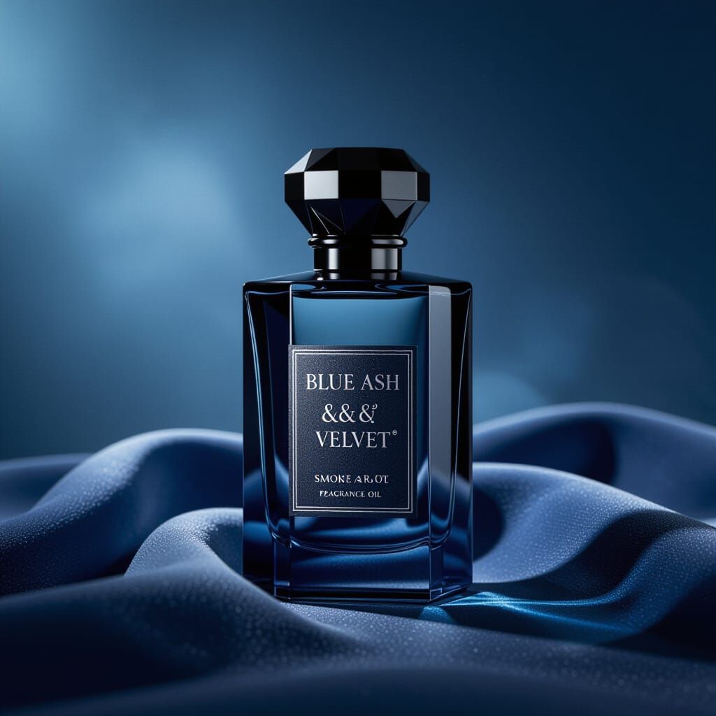 A minimalist product photograph showcasing a sophisticated bottle of Blue Ash & Velvet Smoke fragrance oil. Dramatic studio lighting emphasizes luxury textures against a deep indigo and charcoal gradient background, evoking mystery and elegance.