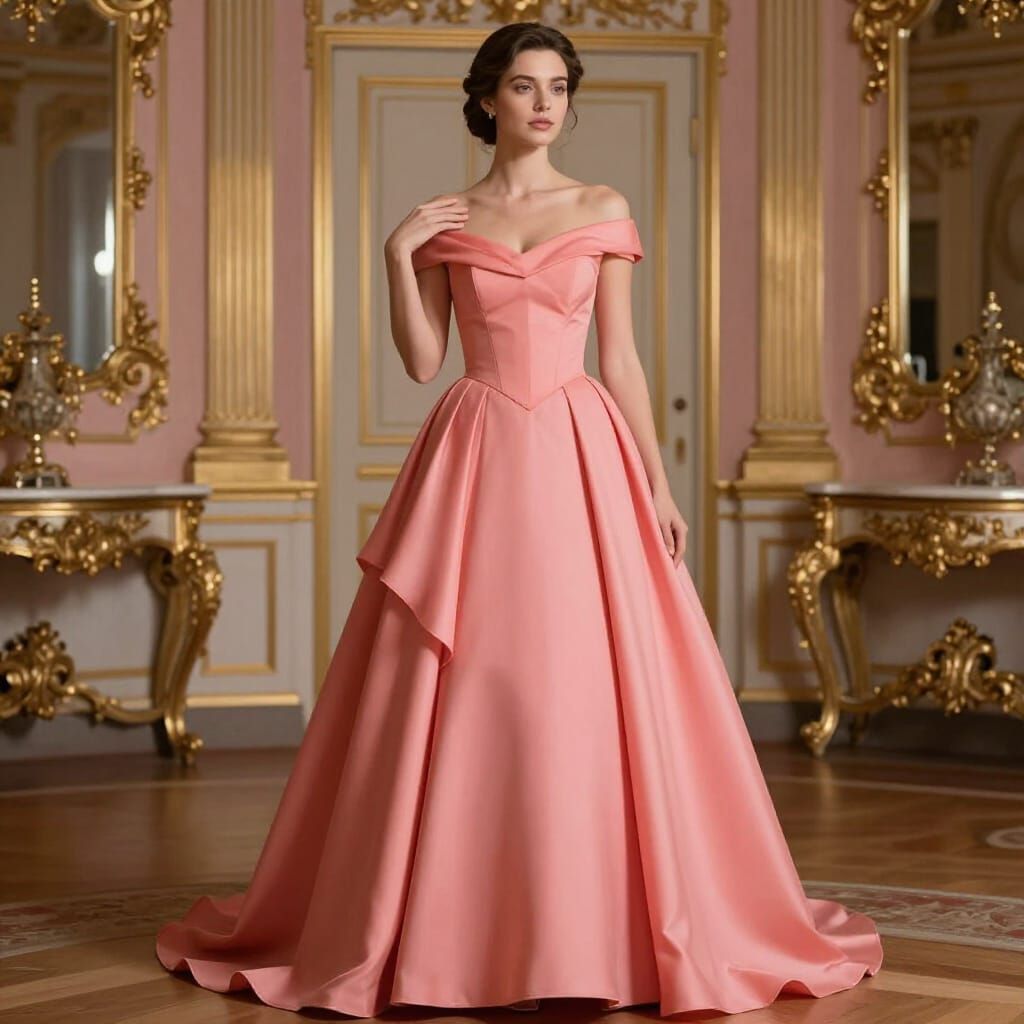 A realistic portrait of a woman in a coral pink royal gown with a layered skirt. The scene is set in an opulent palace, with soft lighting enhancing textures, presented in a photorealistic style.